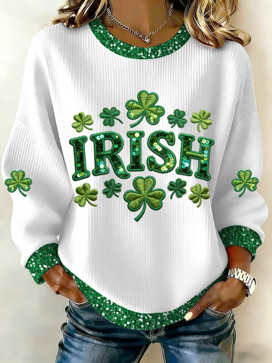 Women's St Patrick's Day Shamrock Ribbed Round-Neck Sweatshirt