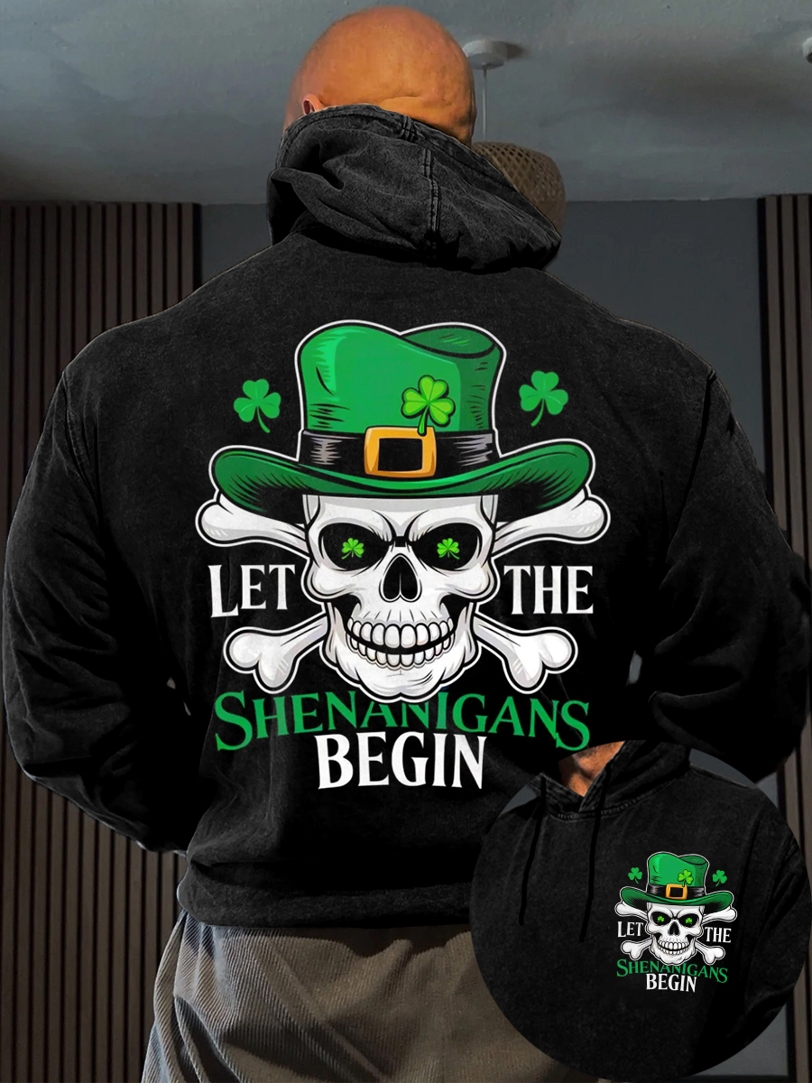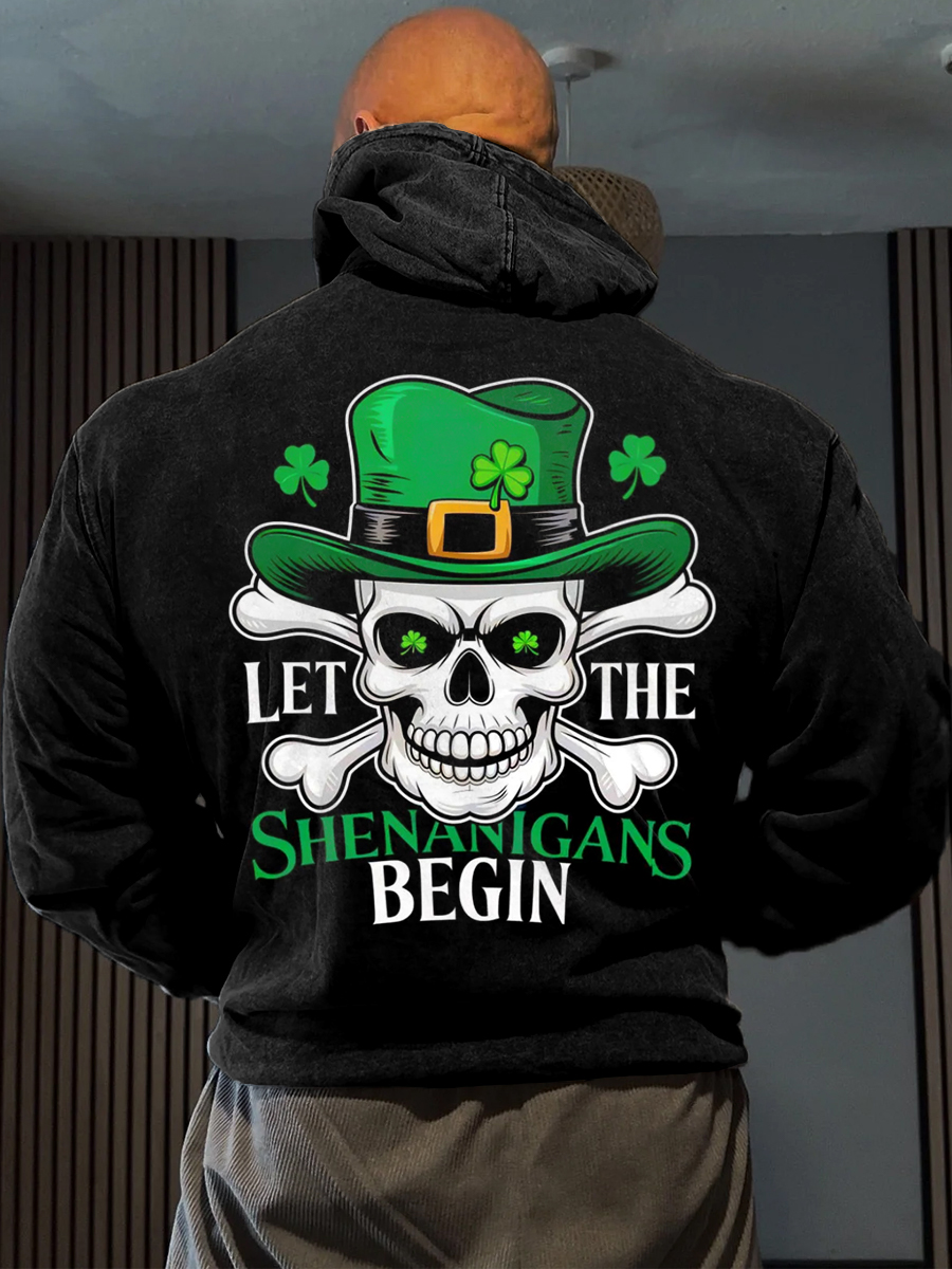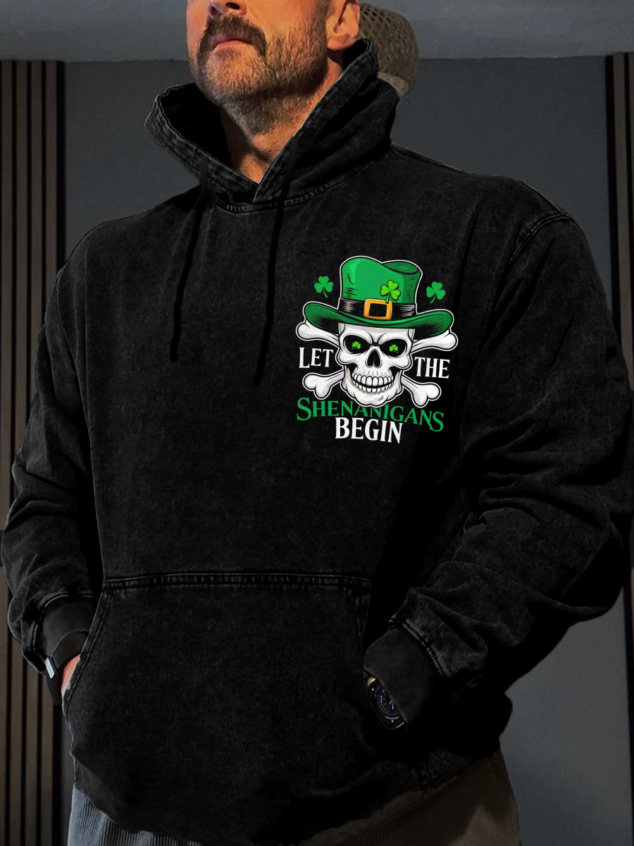 Men's Funny St Patrick's Day Let The Shenanigans Begin Skull Shamrock Print Casual Hoodie